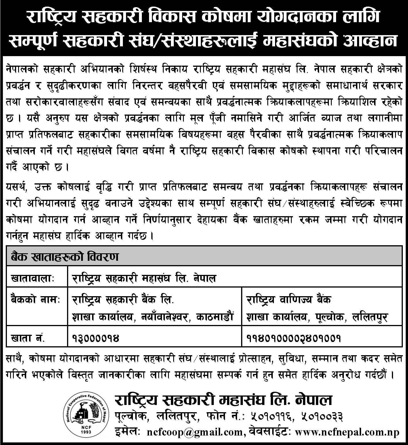 Contributors of National Cooperative Development Fund: National Cooperative Federation of Nepal- NPR 66,39,360.28, National Cooperative Bank Ltd., Lalitpur-NPR 6,06,000, Navajeevan Cooperative Ltd., Kailali- NPR 5,05,555, Sahara Nepal Saving and Credit Cooperative Society Ltd., Jhapa-5,00,000, Nepal Multipurpose Cooperative Ltd., Jhapa,-NPR 3,00,000, Mechi Multipurpose Cooperative Ltd., Jhapa- NPR 2,50,000, District Cooperative Union Limited, Dolakha-NPR 1,11,111, Prakritik Saving and Credit Cooperative Ltd., Lalitpur- NPR 1,11,111, Janakalyan Saving and Credit Cooperative Ltd., Dhading- NPR 1,11,111,Suyogya Saving and Credit Cooperative Ltd., Kathmandu-NPR 1,01,101, Money Plant Saving and Credit Cooperative Ltd., Kathmandu-NPR 55,555, District Cooperative Union, Kavrapalanchowk-NPR 55,555.00, Mahila Saving and Credit Cooperative Ltd., Sunsari-NPR 55,000, Dolakha District Saving and Credit Cooperative Union Ltd., Dolakha- NPR 51,000, Star Multipurpose Cooperative Ltd., Morang- NPR 51,000, Kirtipur Multipurpose Cooperative Ltd., Kirtipur-NPR, 20,000, District Cooperative Union Morang- NRP 21,000.