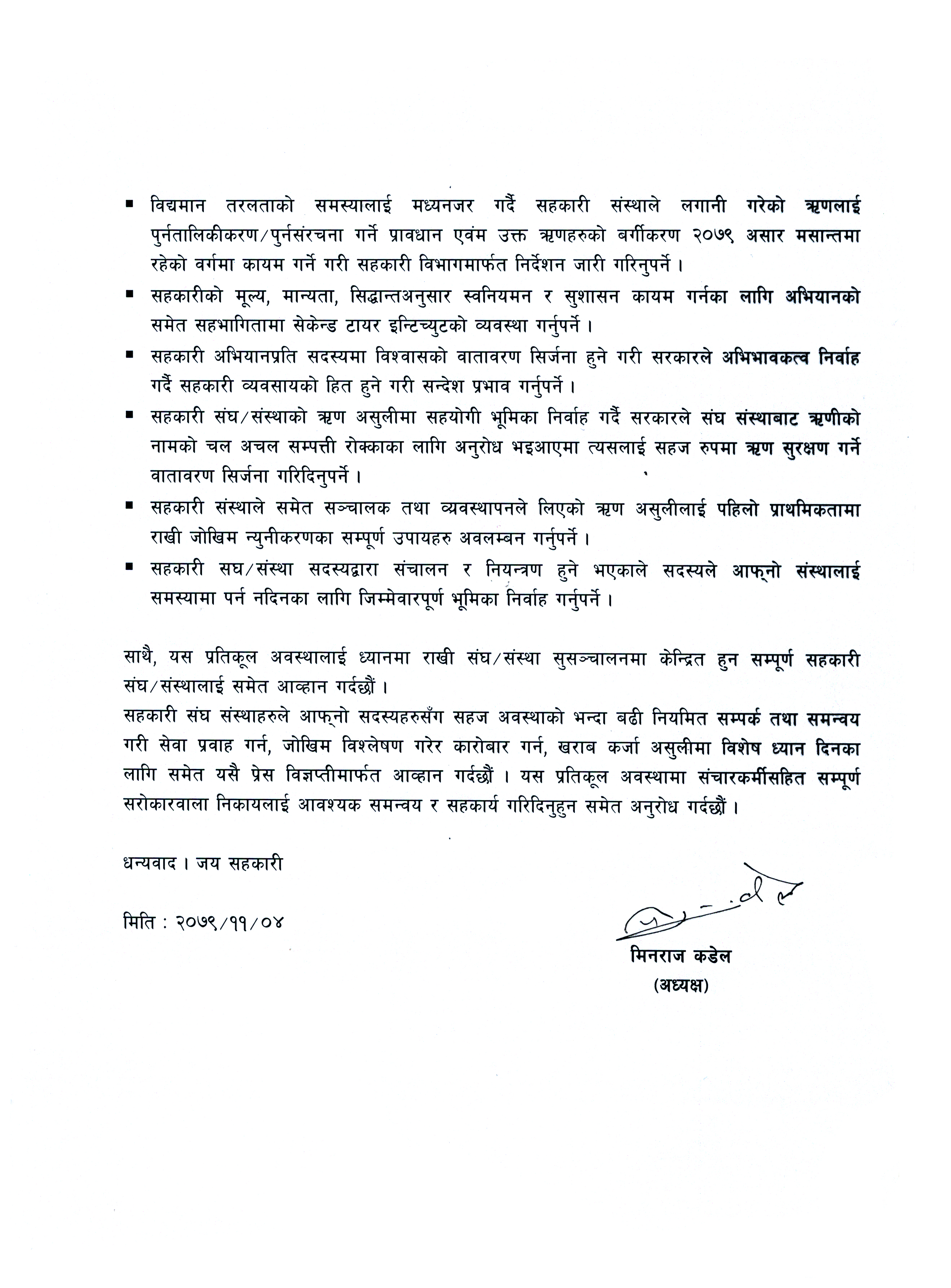 Contributors of National Cooperative Development Fund: National Cooperative Federation of Nepal- NPR 66,39,360.28, National Cooperative Bank Ltd., Lalitpur-NPR 6,06,000, Navajeevan Cooperative Ltd., Kailali- NPR 5,05,555, Sahara Nepal Saving and Credit Cooperative Society Ltd., Jhapa-5,00,000, Nepal Multipurpose Cooperative Ltd., Jhapa,-NPR 3,00,000, Mechi Multipurpose Cooperative Ltd., Jhapa- NPR 2,50,000, District Cooperative Union Limited, Dolakha-NPR 1,11,111, Prakritik Saving and Credit Cooperative Ltd., Lalitpur- NPR 1,11,111, Janakalyan Saving and Credit Cooperative Ltd., Dhading- NPR 1,11,111,Suyogya Saving and Credit Cooperative Ltd., Kathmandu-NPR 1,01,101, Money Plant Saving and Credit Cooperative Ltd., Kathmandu-NPR 55,555, District Cooperative Union, Kavrapalanchowk-NPR 55,555.00, Mahila Saving and Credit Cooperative Ltd., Sunsari-NPR 55,000, Dolakha District Saving and Credit Cooperative Union Ltd., Dolakha- NPR 51,000, Star Multipurpose Cooperative Ltd., Morang- NPR 51,000, Kirtipur Multipurpose Cooperative Ltd., Kirtipur-NPR, 20,000, District Cooperative Union Morang- NRP 21,000.